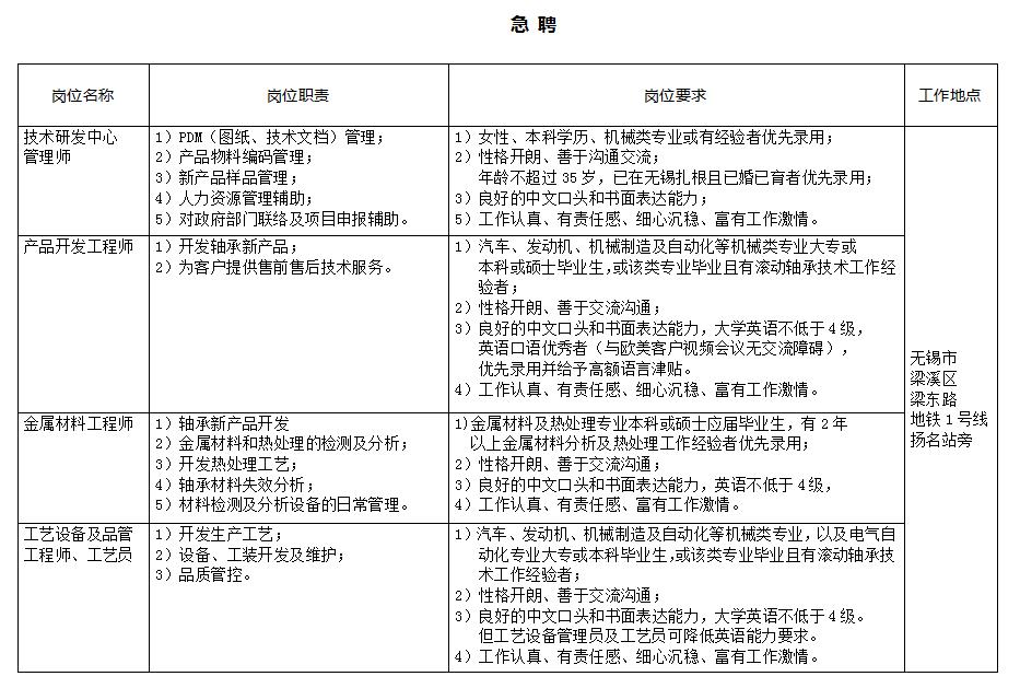 2)专业要求:摩擦学、滚动轴承、金属材料及先进制造相关专业;